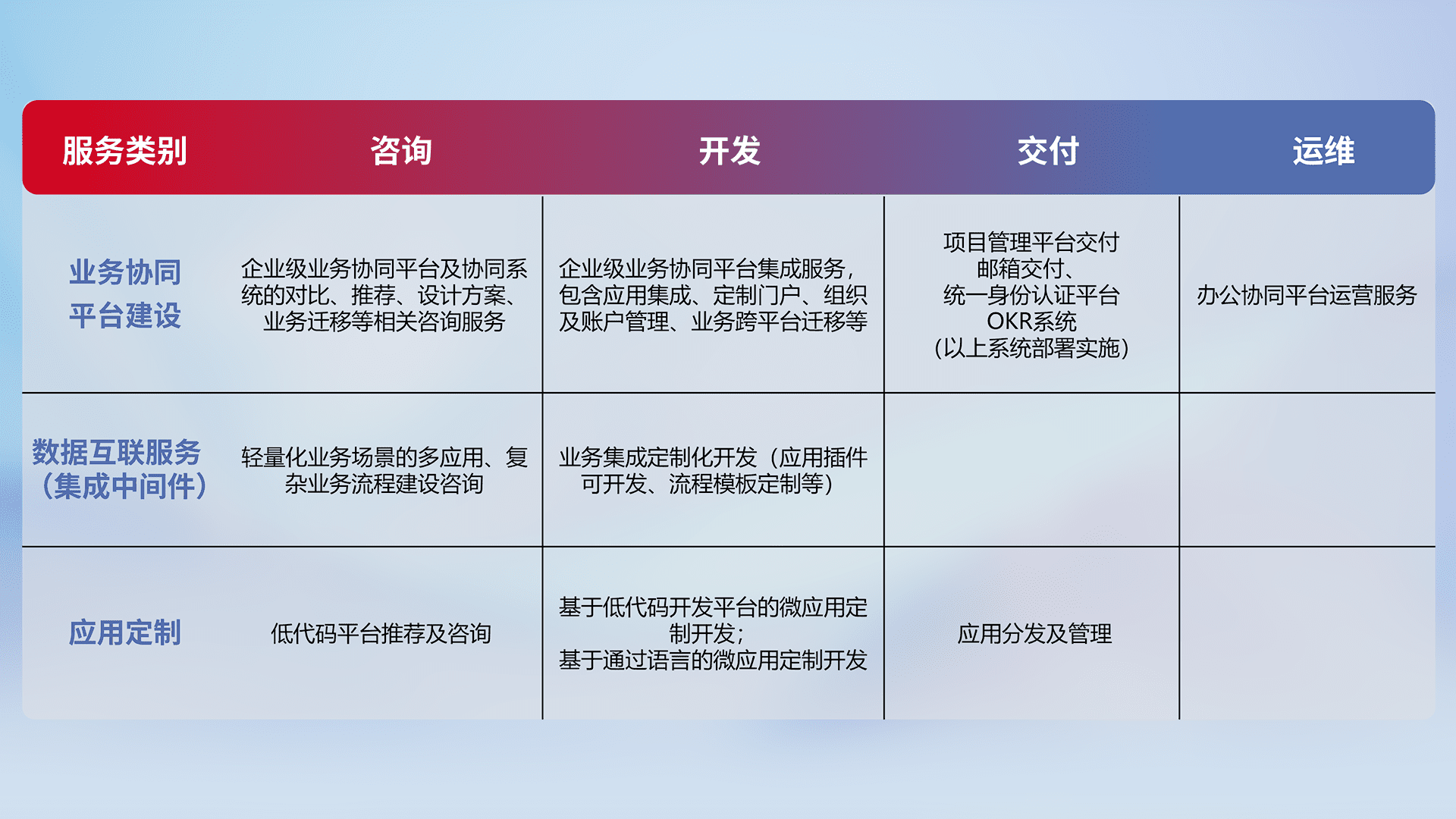 针对钉钉、、、企微、、、IDaas等平台级产品提供产品的规划、、方案、、交付、、、、定制化开发等服务,,,实现如统一协同办公、、智能客户服务、、混合会议管理、、、、智能数据查询、、等业务场景,,,,实现数字化转型。。。